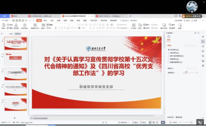 为进一步提高党员自身素质,切实加强理论学习和党性修养。2022年9月22日,研建筑学学硕党支部在线上召开党组织生活会,会议围绕对《关于认真学习宣传贯彻学校第十五次党代会精神的通知》和《四川省高校“优秀支部工作法”》的学习两项议程展开。会议由党支部书记赵夺同志主持,支部党员、预备党员及部分入党积极分子参与。