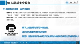 紧接着罗勋锐老师讲解了请销假、校外住宿、实习备案等请假手续相关事宜,然后以守护国家安全、维护民族团结为切入点,讲解一系列违法违规的严重后果,希望同学们能遵守道德法律,遵守校规校纪,做遵循守法的好公民。随后从财产安全、人身安全、网络安全三个方面对新生进行安全教育。罗勋锐老师分享了防范危险的方法,并提示同学们安全上网、文明上网,同时罗勋锐老师表示同学们在上网时应注意个人信息保密,谨防网骗,希望同学们在本次讲座后树立起防骗意识。最后,研究生会主持人对本次活动进行总结,新生入学教育讲座顺利落幕。