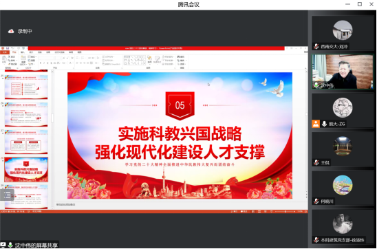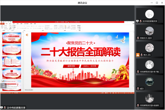 2022年12月1日下午16点30分,公司博士党支部邀请学院沈中伟教授,采用线上腾讯会议的方式,组织召开以“二十大报告全面解读”为主题的党日活动。本次党课内容主要包括加快构建新发展格局、科教兴国、人民民主、依法治国、文化自信、民生福祉、绿色发展、祖国统一、和平发展、从严治党等15个方面的内容。