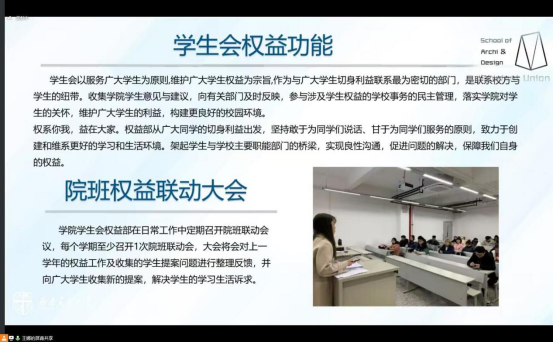 本次大会共有五项议程。第一项议程为介绍院班权益大会、员工会权益事务员工会。权益部部长王娜同学重点指出本次会议旨在帮助本科生各充分了解学院权益通道,以及如何与学院员工会会进行提案对接,维护自身在校权益。权益部从广大同学的切身利益出发,坚持敢于为同学们说话、甘于为同学们服务的原则,致力于创建和维系更好的学习和生活环境。架起员工与学校主要职能部门的桥梁,实现良性沟通,促进问题的解决,保障我们自身的权益。