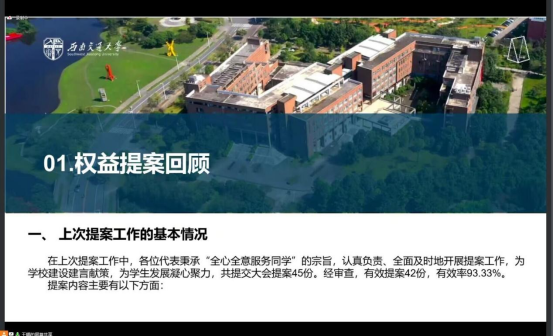 大会第二项议程为回顾权益提案。王娜同学表示,在前期提案工作中,各位代表秉承“全心全意服务同学”的宗旨,积极开展提案工作,为学校建设建言献策,为员工发展凝心聚力,共提交大会提案45份。经审查,有效提案42份,有效率93.33%。