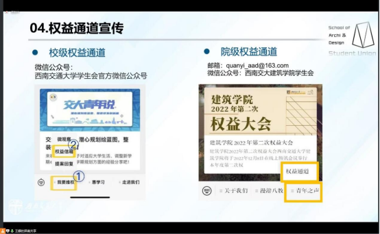 大会第四项议程为宣传权益通道。王娜同学向大家介绍如何通过校级、院级权益通道提交权益诉求,以及学校各生活服务中心、后勤保障中心的联系方式,希望同学们在日常学习生活中遇到的问题都能得到妥善高效的处理。