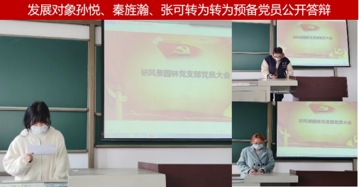 会议伊始,研风景园林党支部召开员工党员大会,根据支部发展党员工作计划,对关于3名发展对象转为预备党员、1名预备党员同志能否按期转正分别进行讨论和表决。发展对象孙悦、秦旌瀚、张可就对党认识、入党动机、思想理论学习的情况、以及阐述自己日常工作、科技竞赛、社会实践、志愿服务等方面中如何践行党员先锋模范作用,最后表明自己坚定不移入党的决心和为人民服务的坚定信念。