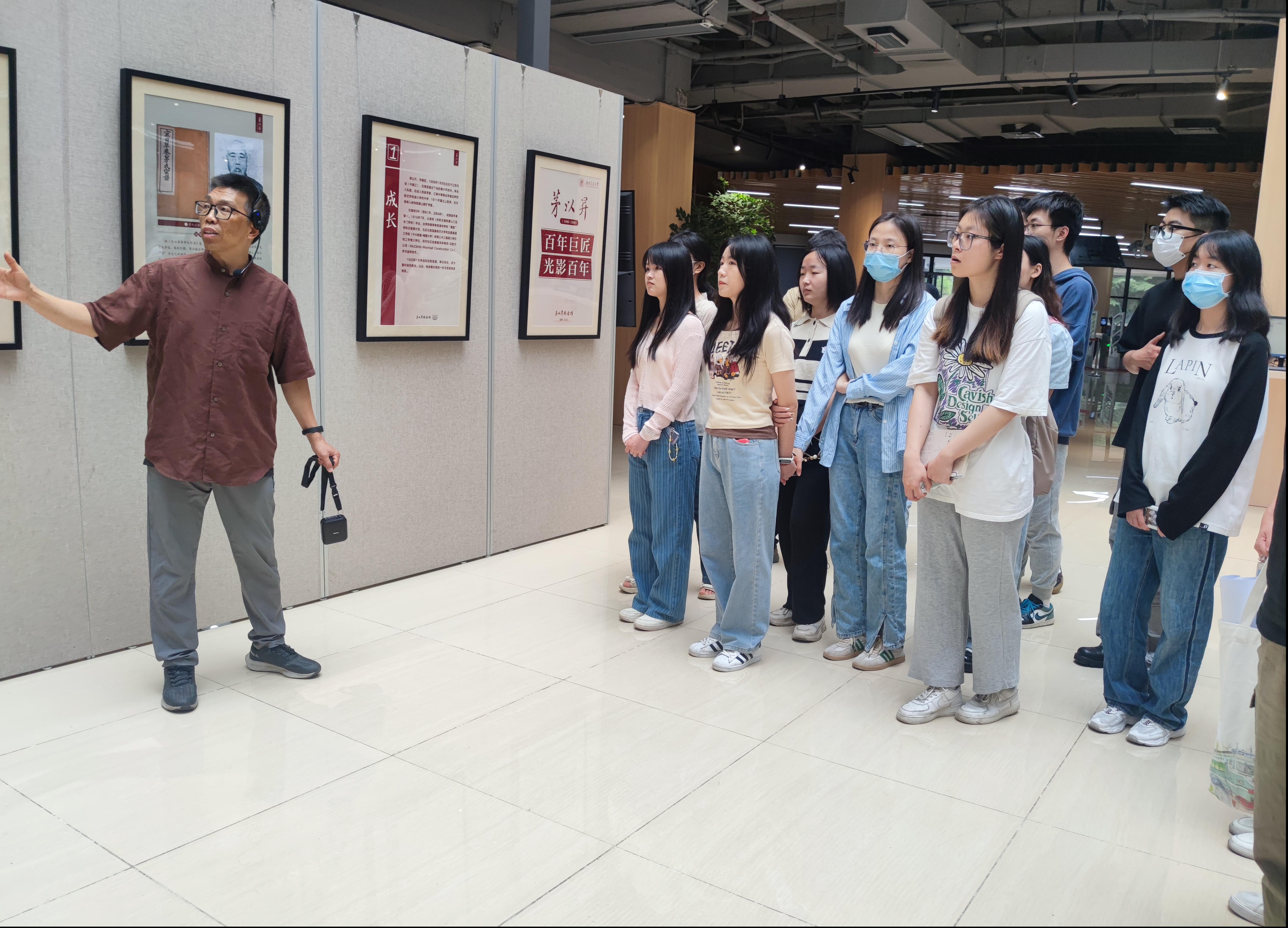 活动伊始,同志们自行参观,了解茅以升为祖国为人民所做的不可磨灭的贡献及其波澜壮阔的一生。接着,支部成员在策展人、图书馆副研究馆员、校史专家杨永琪老师的引导讲解下,知晓了此次展览聚焦茅以升的成长、求学、为师为学、科学与工程实践,投身新中国的建设等内容,分为《成长》、《师者》、《科工》与《新生》四个篇章,利用贯穿茅以升人生历程的80个场景,以珍贵历史影像配以文字的呈现方式,再现茅以升波澜壮阔的人生历程,生动地展示了他作为桥梁专家、科学家、教育家、社会活动家,一生追求真理、追求科学、追求光明、甘于奉献的宝贵品质,用实际行动诠释了“爱国、科学、奋斗、奉献”的茅以升精神内涵。最后,杨老师总结道“茅老虽然只有很短的党龄,但他在党外为党和国家所作贡献是贯穿终生的。”